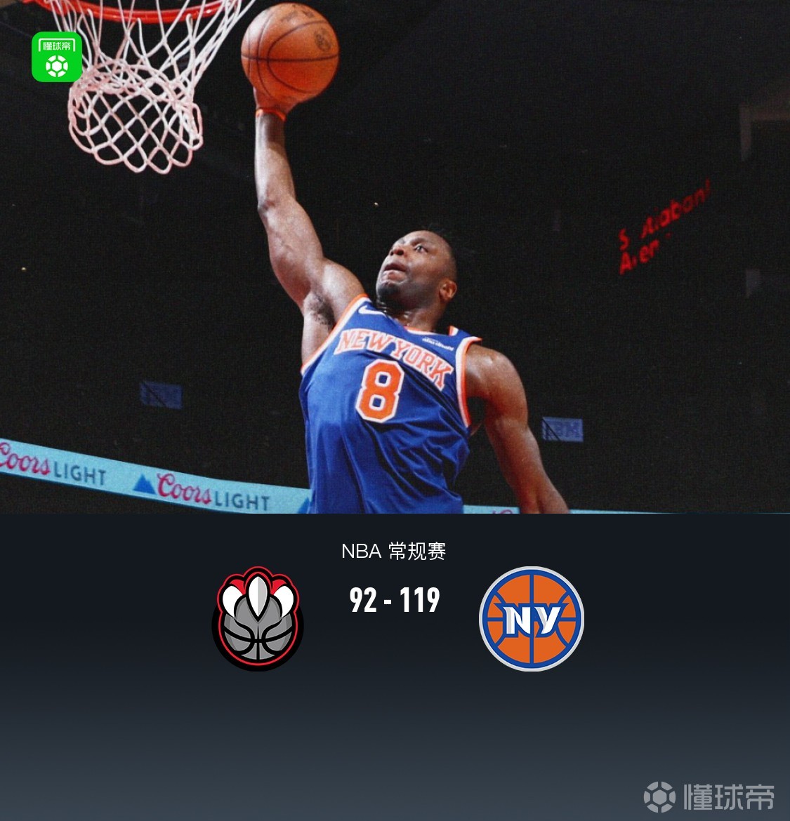 尼克斯119-92终结猛龙4连胜,布里奇斯30分,唐斯22篮板