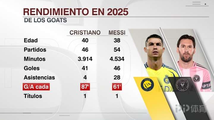英超新闻今天是2025年的最后一天,ESPN盘点并对比了40岁的C罗和38岁的梅西在今年的数据。