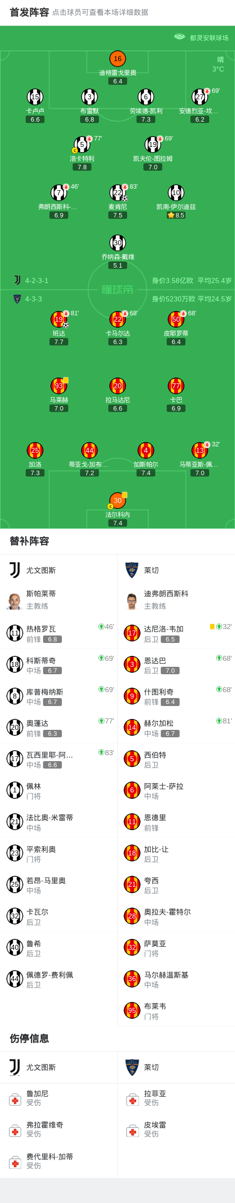 第32分钟,莱切做出人员调整,达尼洛-韦加上场替换马蒂亚斯-佩雷斯