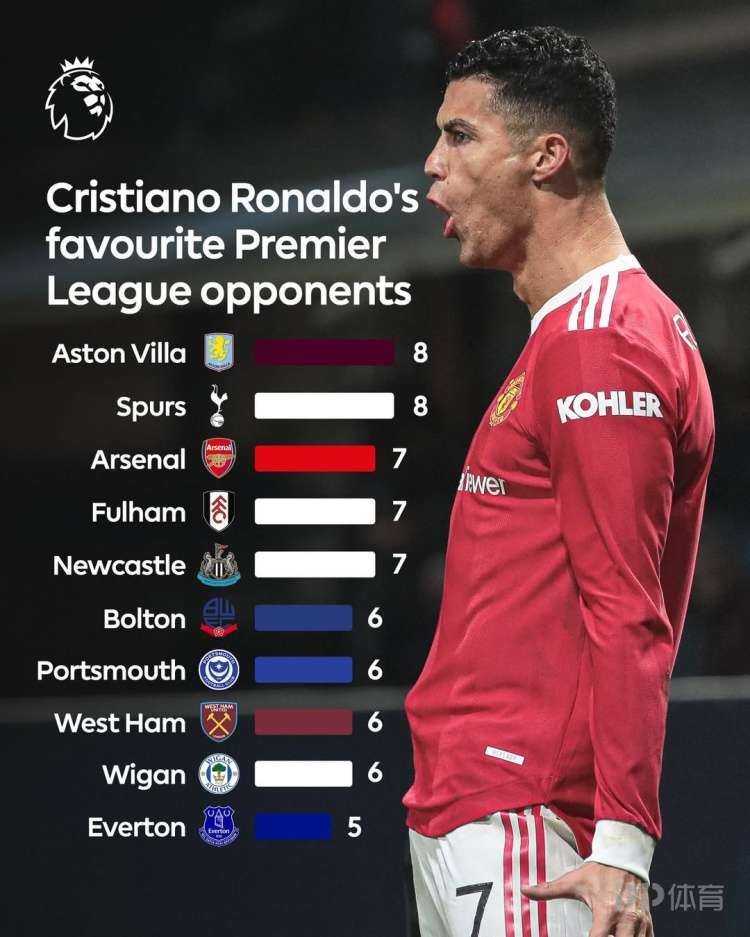 官方列C罗英超最爱对手榜:维拉热刺8球并列榜首 阿森纳7球