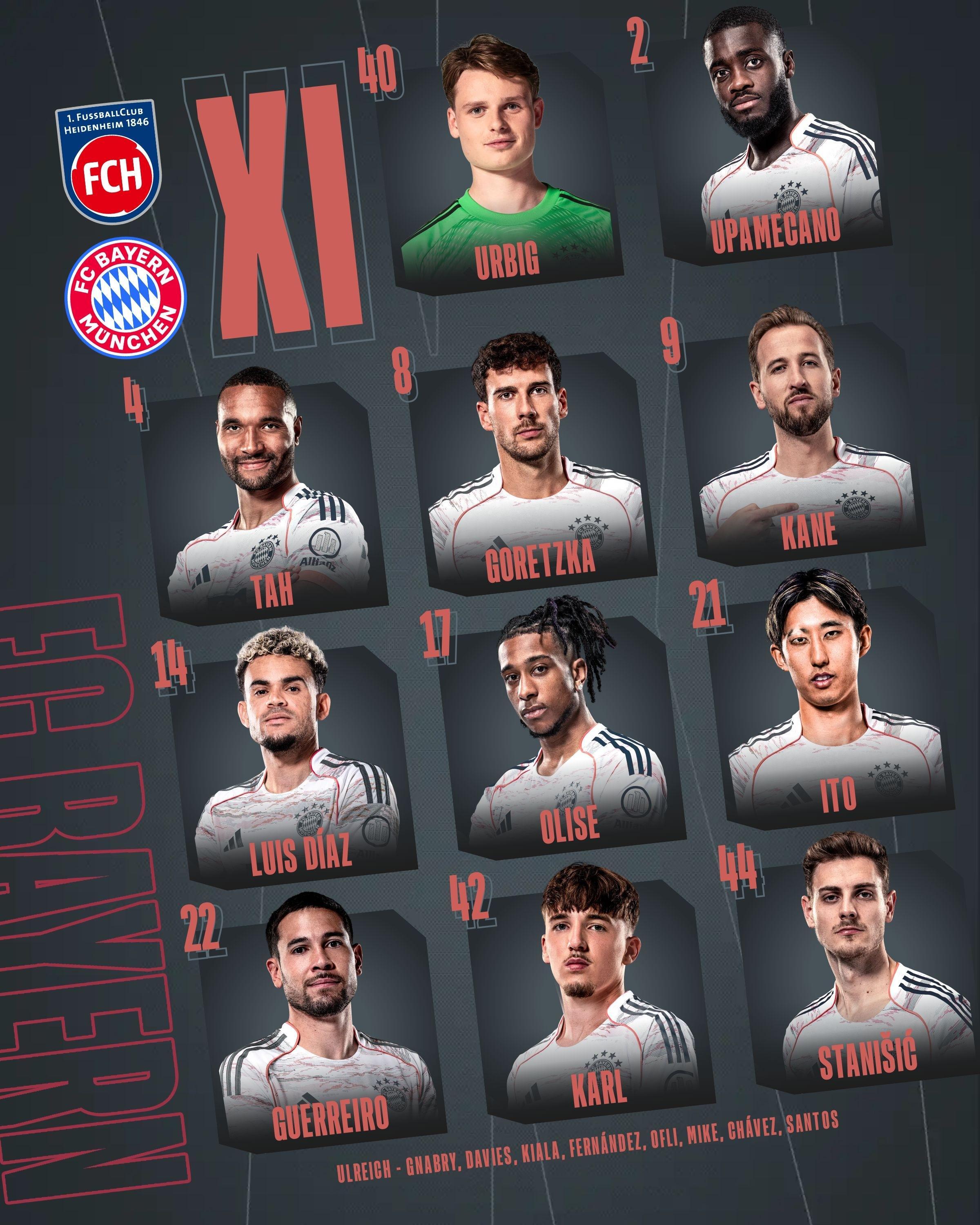 拜仁客战海登海姆:凯恩领衔,卡尔、迪亚斯、格雷罗首发