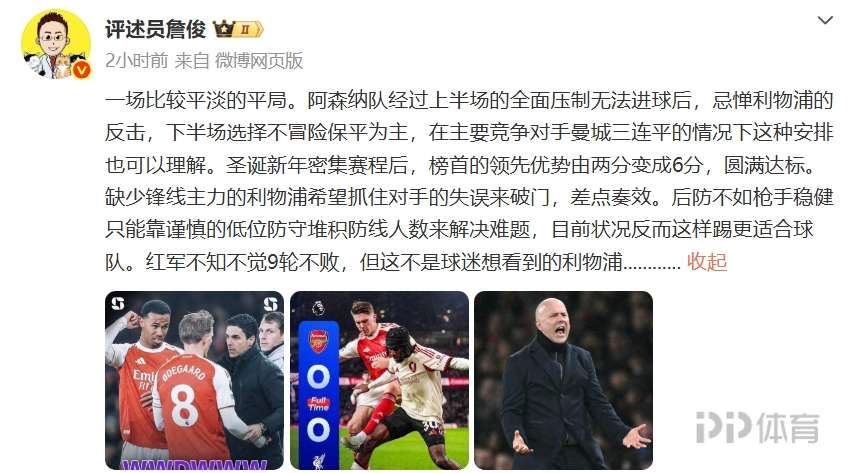 英超新闻英超第21轮焦点战,阿森纳主场0-0战平利物浦,赛后,知名评论员詹俊更新社交媒体,对本场比赛进行了点评。