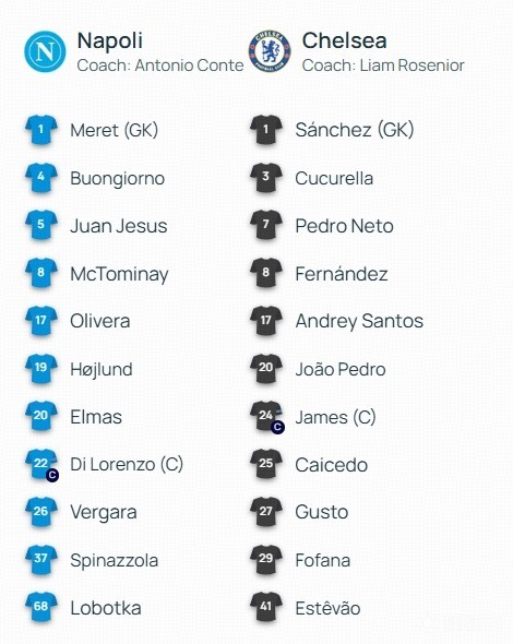 那不勒斯首发:1-梅雷特、4-布翁焦尔诺、17-奥利韦拉、22-迪洛伦佐、37-斯皮纳佐拉、5-热苏斯、26-韦尔加拉、8-麦克托米奈、20-埃尔马斯、68-洛博特卡、19-霍伊伦