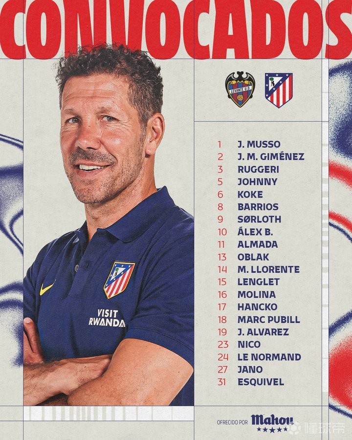马竞战莱万特名单:格子、小西蒙尼缺阵,一队外场球员剩16人
