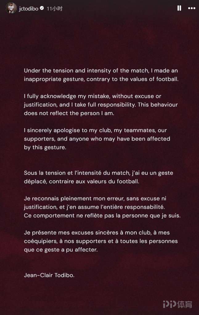 托迪博写道:“在紧张激烈的比赛氛围下,我做出了不恰当的举动,违背了足球的价值观。我在此完全承认我的错误,没有任何借口可言,我将承担全部责任,这一举动并不彰显我的为人。