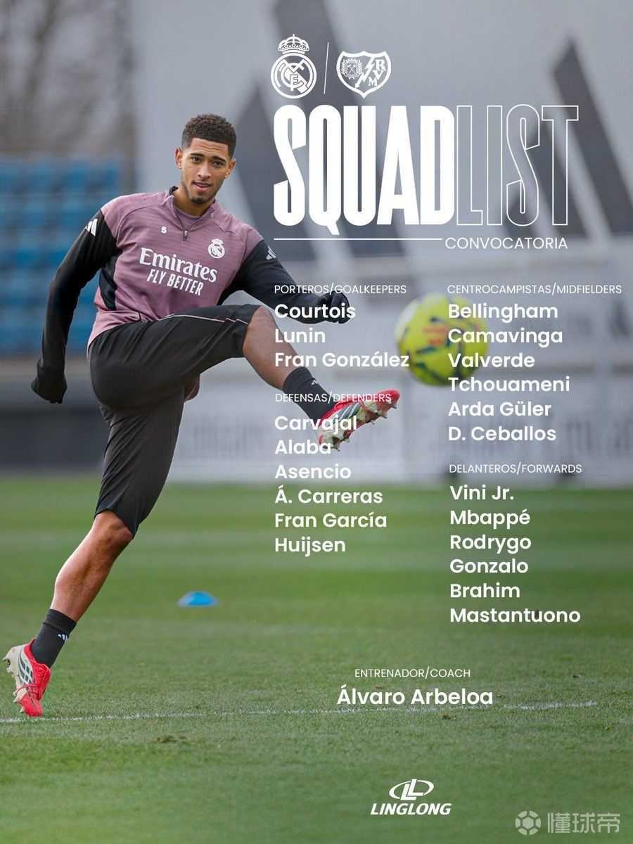 英超新闻皇家马德里官方公布了西甲第22轮主场对阵巴列卡诺的比赛大名单,姆巴佩领衔,维尼修斯、贝林厄姆在列。