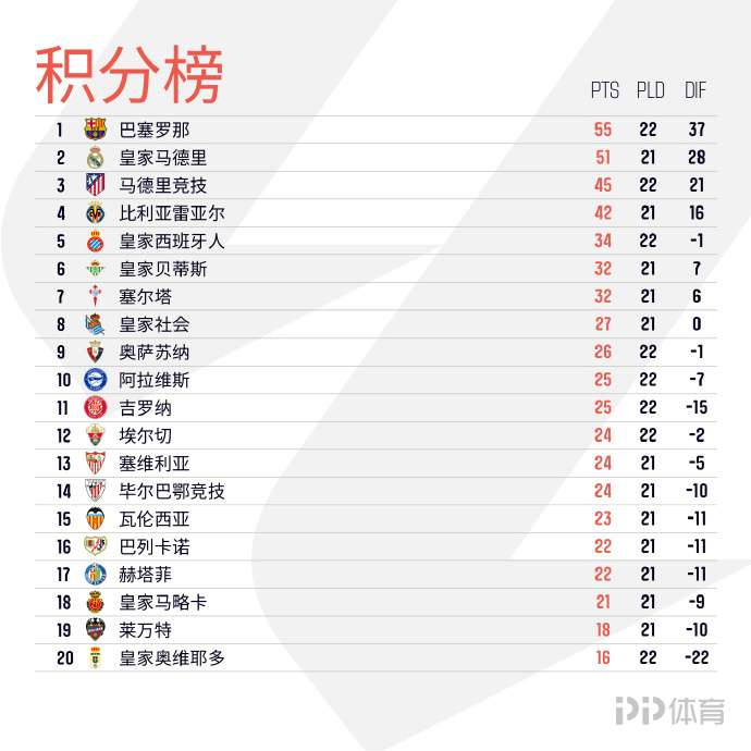 西甲积分榜:巴萨先赛4分领跑 皇马今晚对阵巴列卡诺