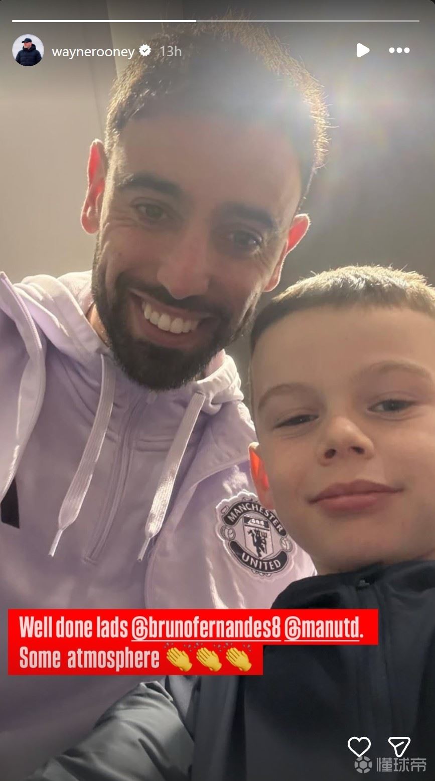 赛后,鲁尼在社媒晒出了B费和自己小儿子的合影,并表扬了曼联球员今天的表现:“做得好啊伙计们。”