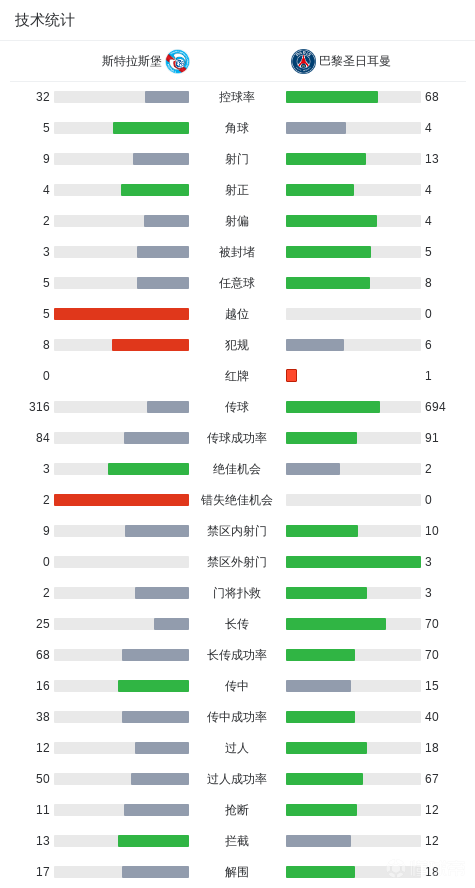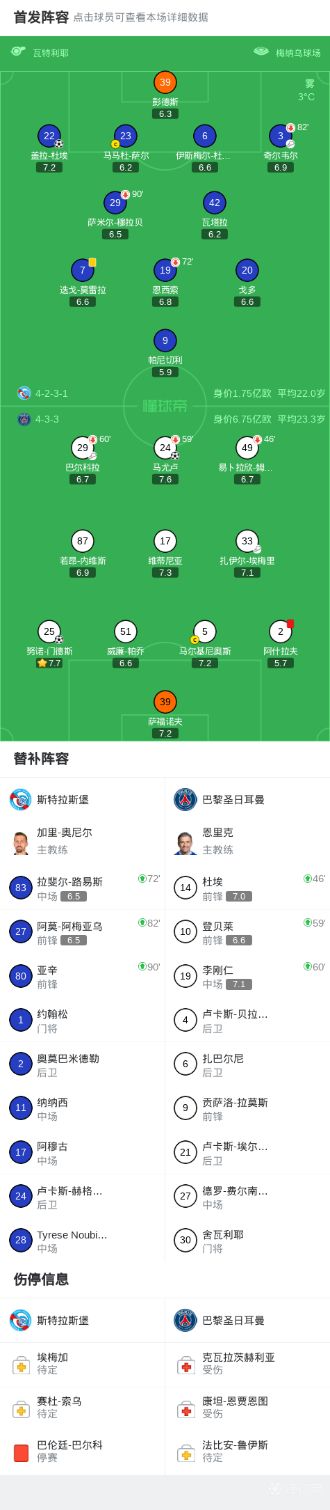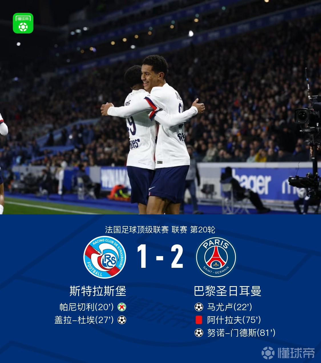 北京时间2月2日法国足球顶级联赛 联赛 第20轮,斯特拉斯堡主场对阵巴黎圣日耳曼。上半场帕尼切利点射被扑,马尤卢捡漏破门,盖拉-杜埃扳平比分,下半场阿什拉夫踩踏染红,门德斯头球建功。最终比分斯特拉斯堡 1-2 巴黎圣日耳曼。
