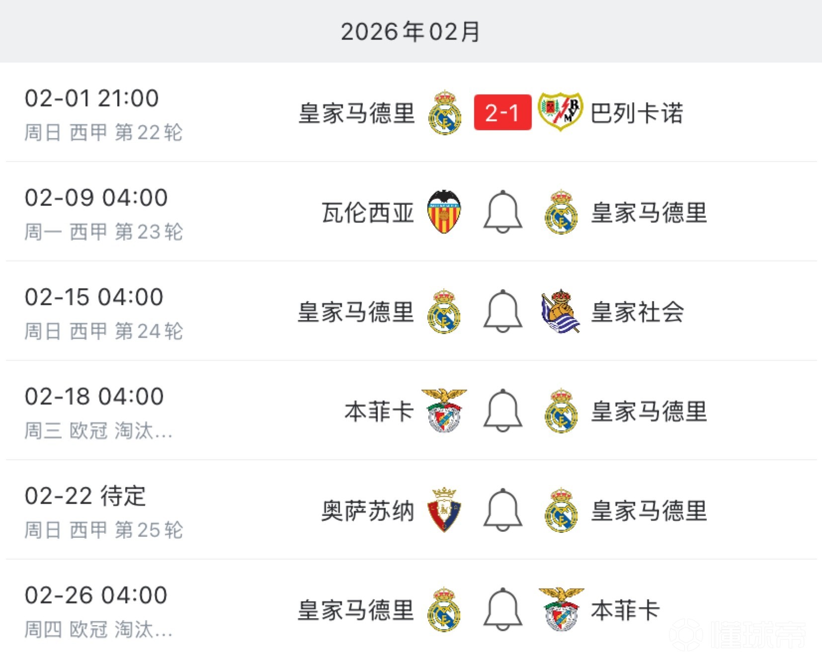 如果贝林厄姆在2月无法出战,他将缺席与本菲卡的两回合欧冠淘汰赛附加赛。