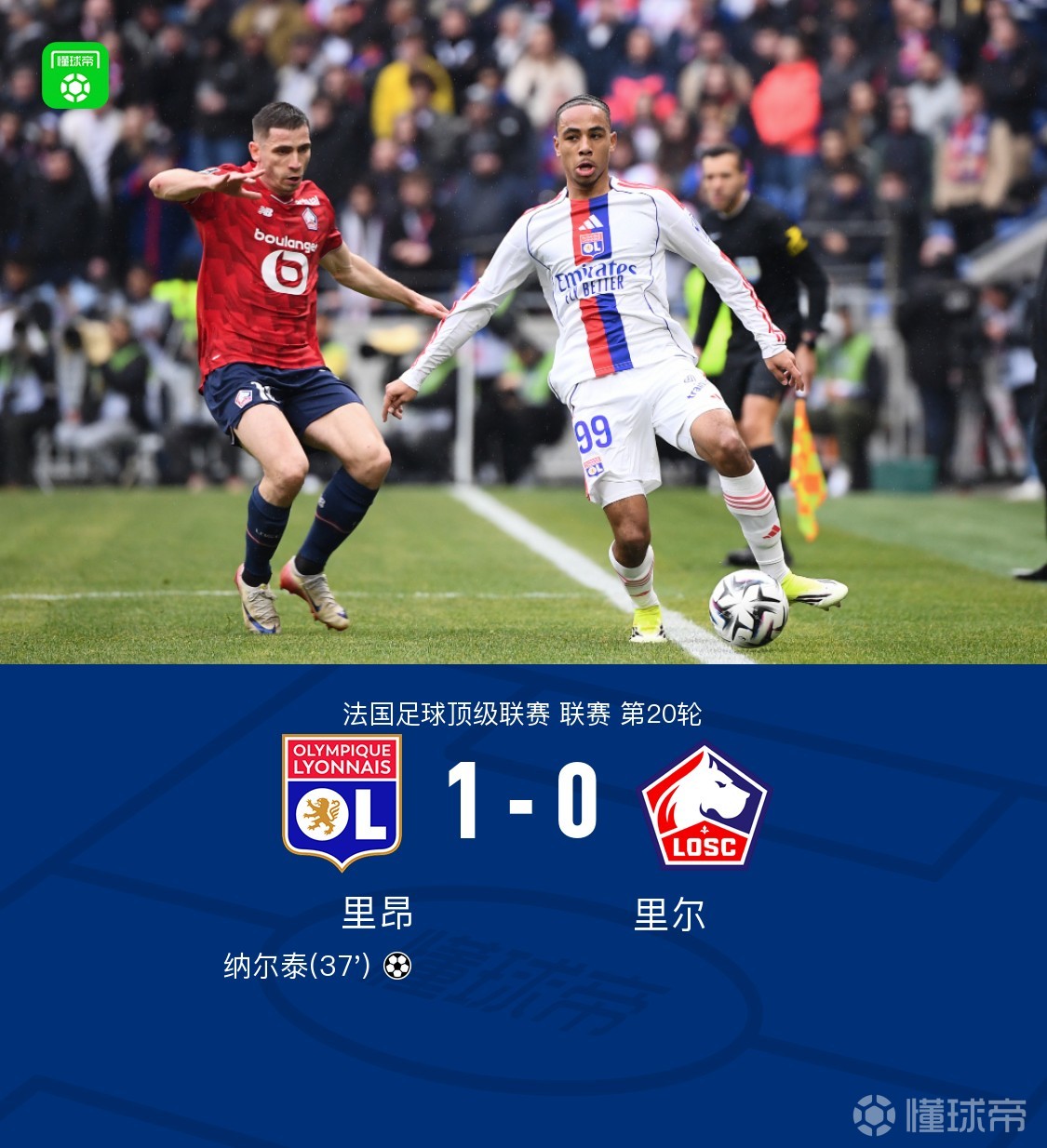 第37分钟,纳尔泰插上推射破门,里昂1-0领先里尔