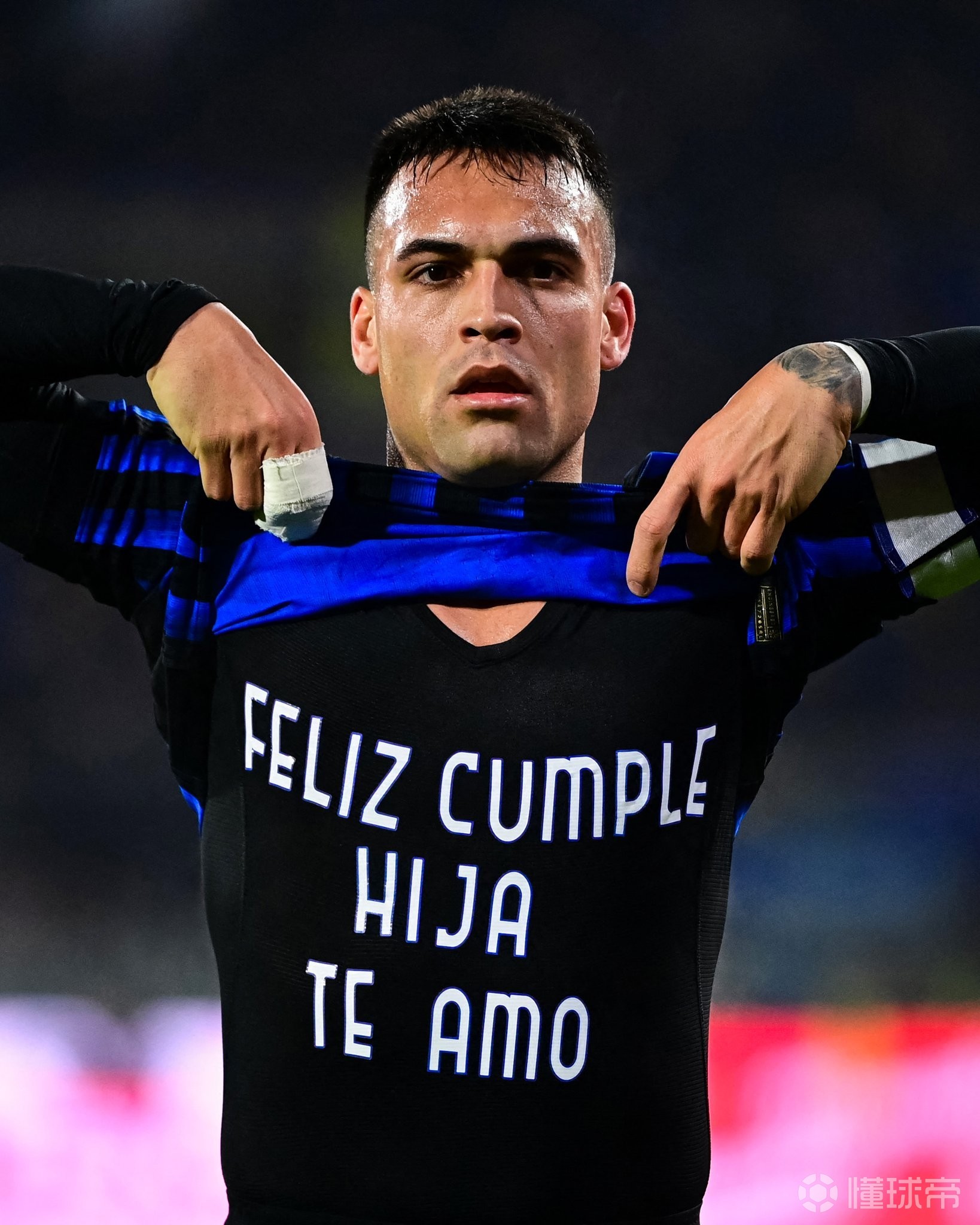 在进球之后,劳塔罗掀开了自己的球衣并亮出了印在比赛背心上的一句话:“生日快乐妮娜,我爱你。”