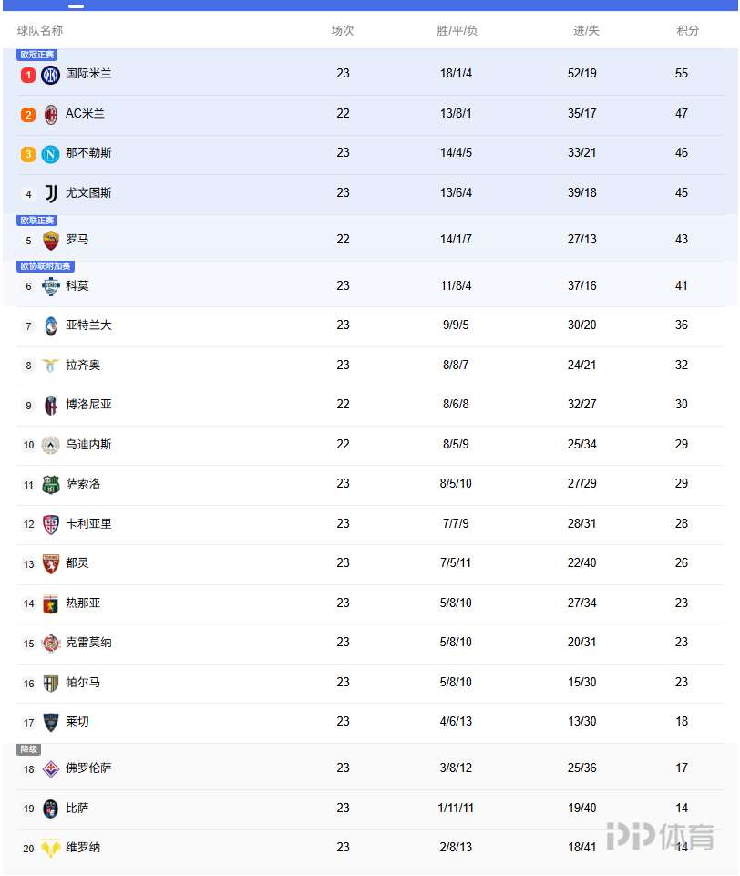 本轮意甲,尤文4-1大胜帕尔马,此前结束的国米2-0克雷莫纳;未赛的米兰将客战博洛尼亚,罗马将客战乌迪内斯。最新积分榜情况如下: