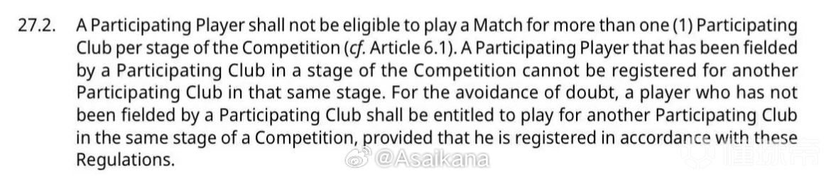亚冠规定同一阶段一个球员最多只能为一家俱乐部出场比赛