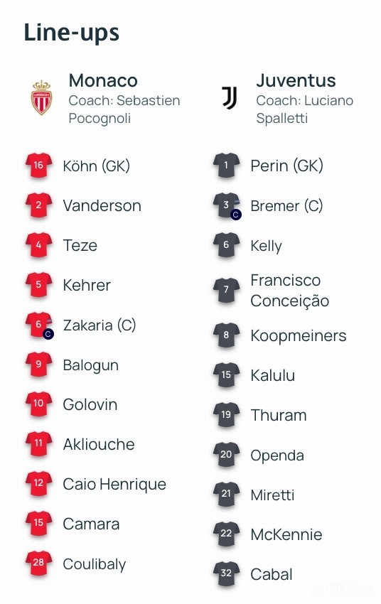 英超新闻北京时间1月29日04:00,欧冠联赛阶段的一场对决。摩纳哥坐镇主场,迎战尤文图斯。赛前,双方的阵容公布如下: